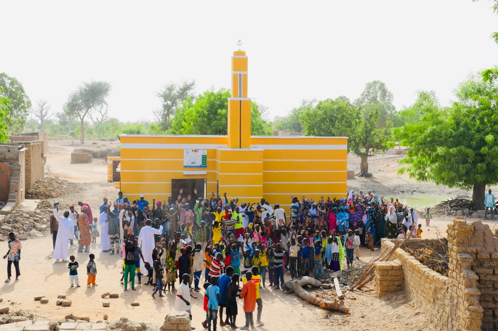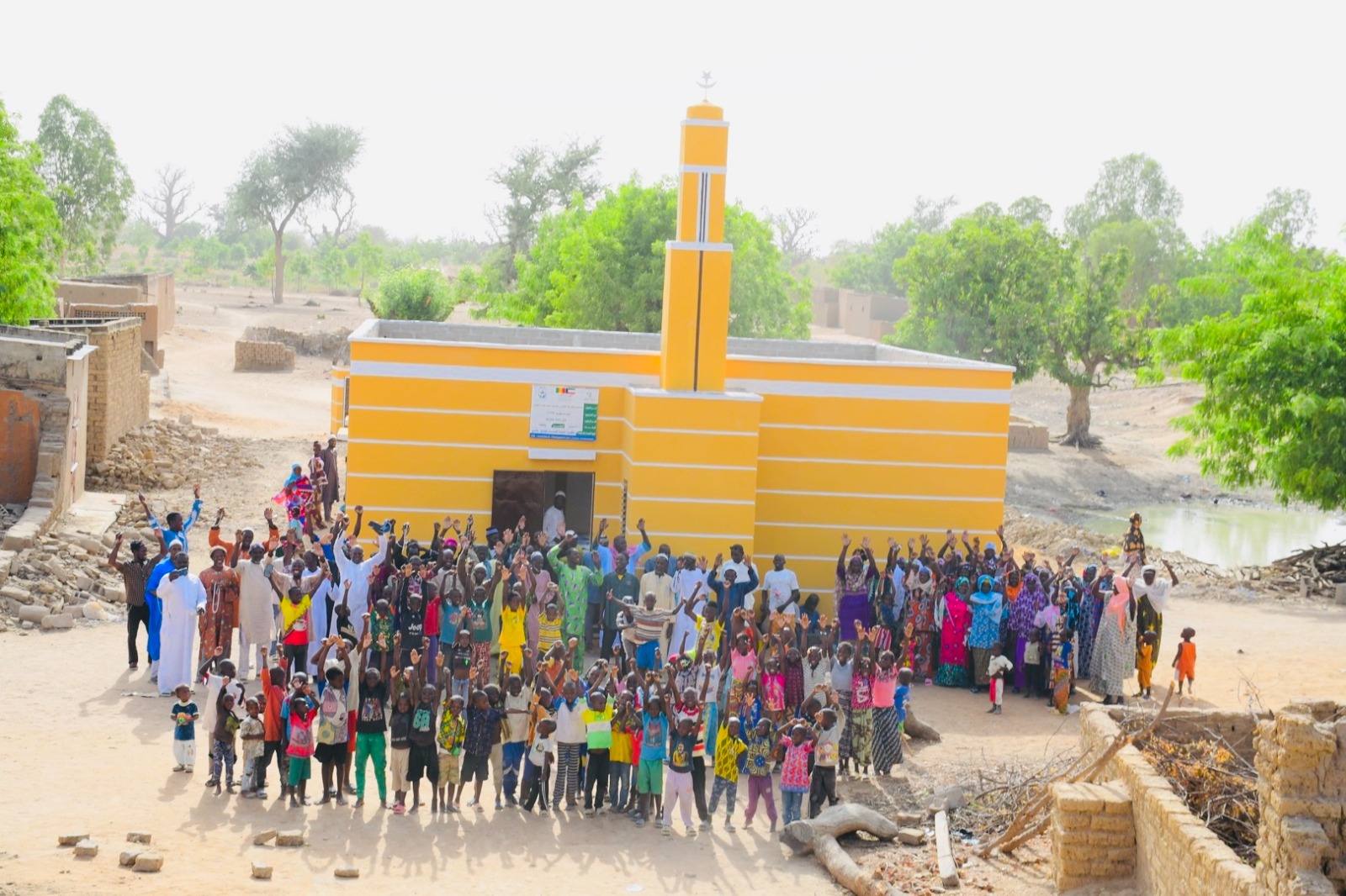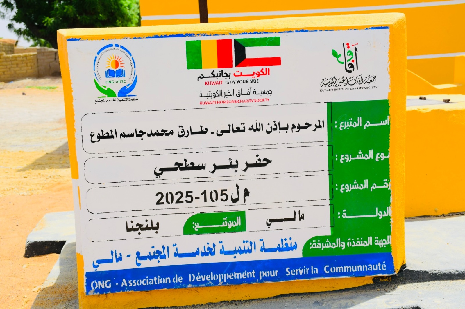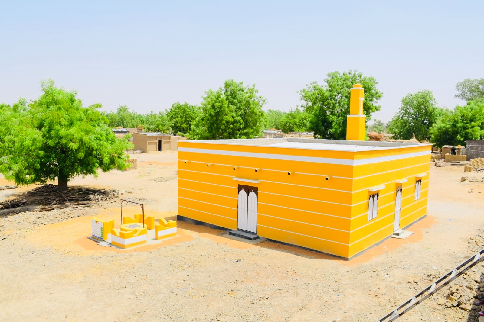 نموذج بناء مسجد 100 متر مربع وبئر سطحي بلو في مالي بالطوب والاسمنت والحديد والخرسانة المسلحة مسقف بالزنك والخشب العازل للحرارة، مع التجهيز ودورات مياه تسع لعدد 160 مصل بتكلفة 5000 د.ك