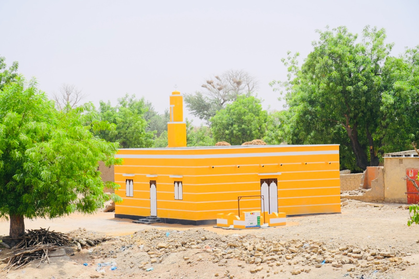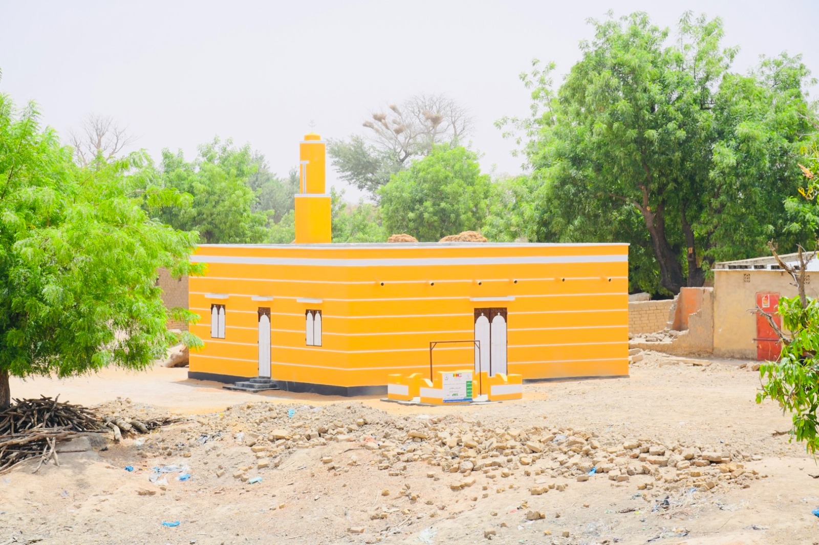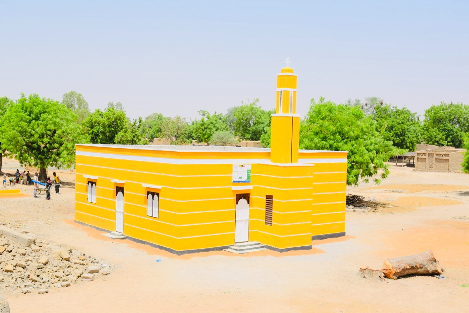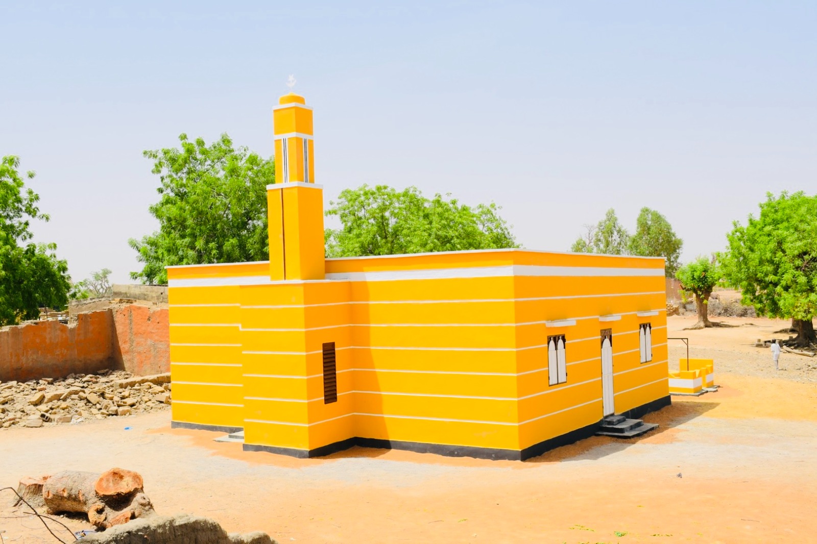 نموذج بناء مسجد 100 متر مربع وبئر سطحي بلو في مالي بالطوب والاسمنت والحديد والخرسانة المسلحة مسقف بالزنك والخشب العازل للحرارة، مع التجهيز ودورات مياه تسع لعدد 160 مصل بتكلفة 5000 د.ك